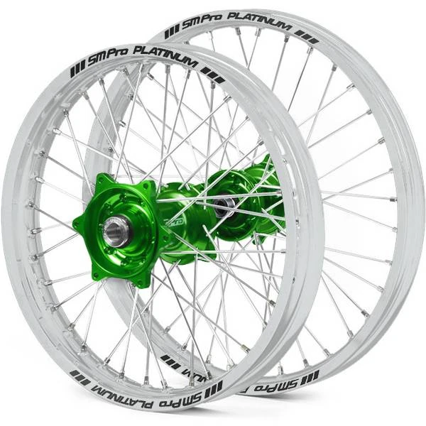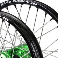SM Pro Platinum Kawasaki Motocross Wheel Set with Green Hubs, Silver Rims, Silver Nipples & Spokes